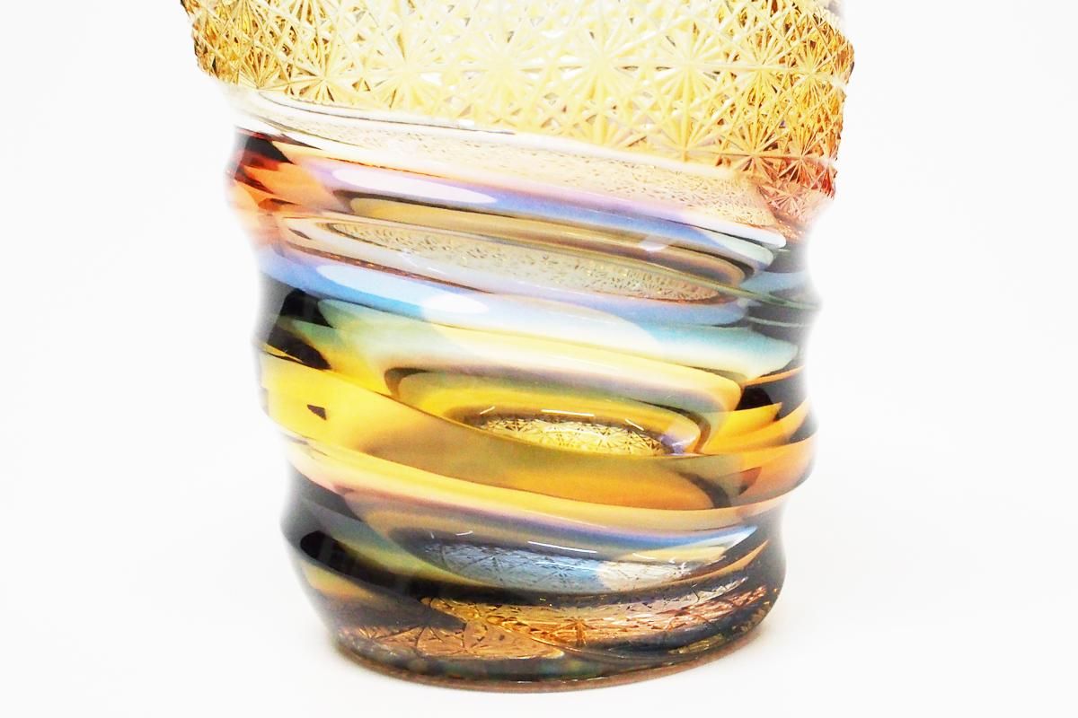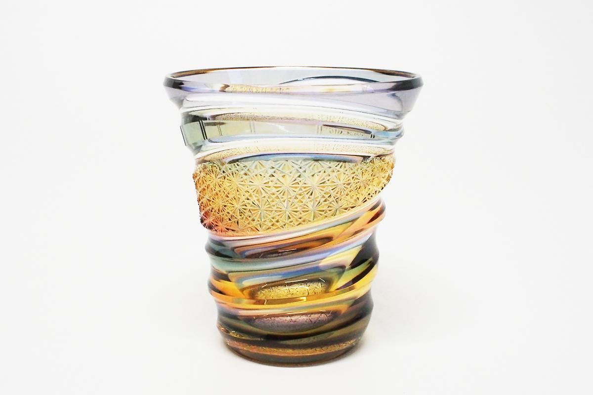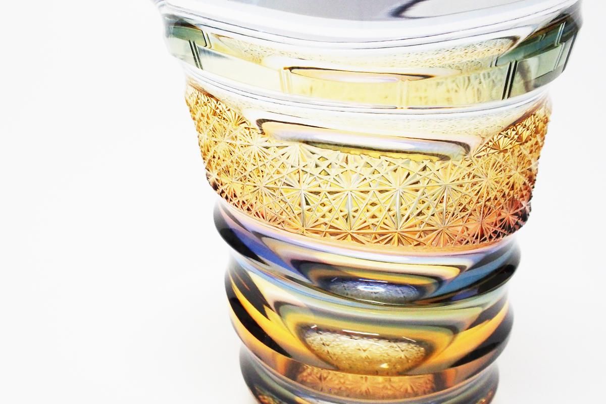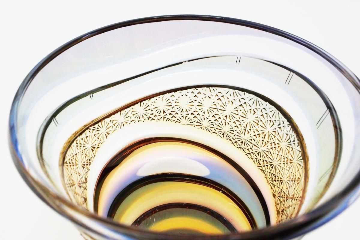 All Uno glass pieces are one-of-a-kind, created by Kouhei Kobayashi using his original "Sagging faceting(kiriko)" technique. First, the vessels are made in an electric furnace using the sagging technique, which utilizes heat and gravity, and then kiriko is applied to the shaped vessels to complete the process. The name "Uno glass" has two meanings. One is that he creates each piece by himself, from the production of the glass material to the final product, The other is that when sagging, the glass melts and falls through the hole, which looks like the letter U.