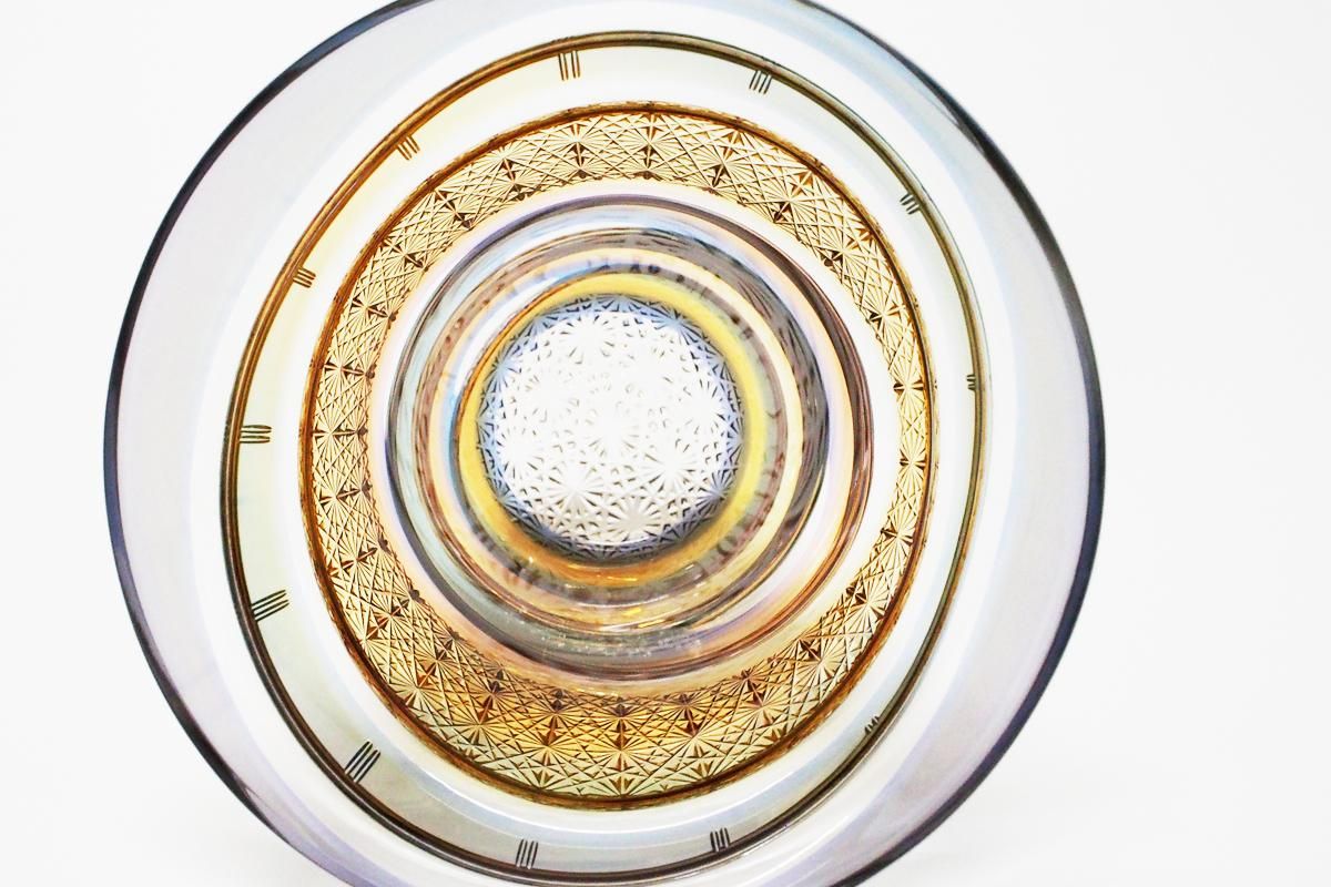 「サギング」は電気炉を使用したガラス工芸技法のひとつで、丸い穴の開いた板状の型の上に板ガラスを置いて熱することで、穴からガラスを落として器をつくる技法です。そのサギングと切子を組み合わせたオリジナル技法が「サギング切子」です。