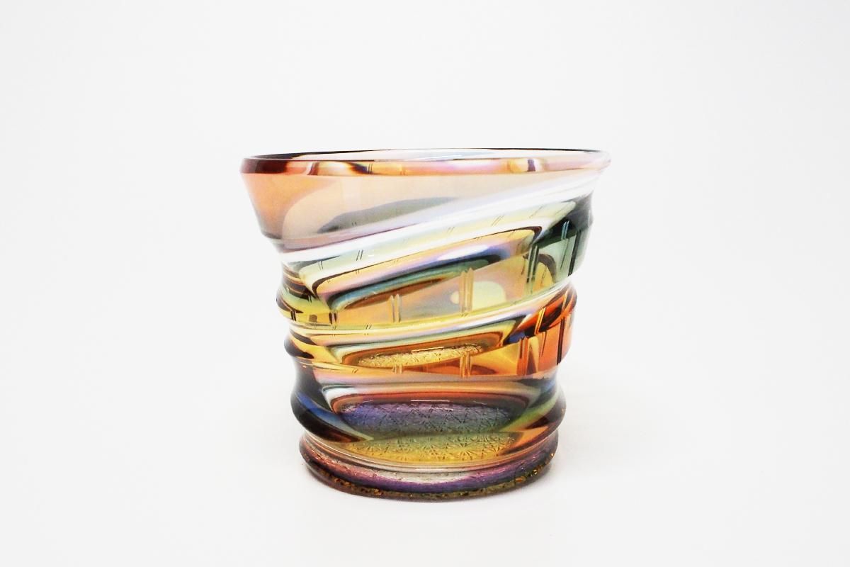 All Uno glass pieces are one-of-a-kind, created by Kouhei Kobayashi using his original "Sagging faceting(kiriko)" technique. First, the vessels are made in an electric furnace using the sagging technique, which utilizes heat and gravity, and then kiriko is applied to the shaped vessels to complete the process. The name "Uno glass" has two meanings. One is that he creates each piece by himself, from the production of the glass material to the final product, The other is that when sagging, the glass melts and falls through the hole, which looks like the letter U.