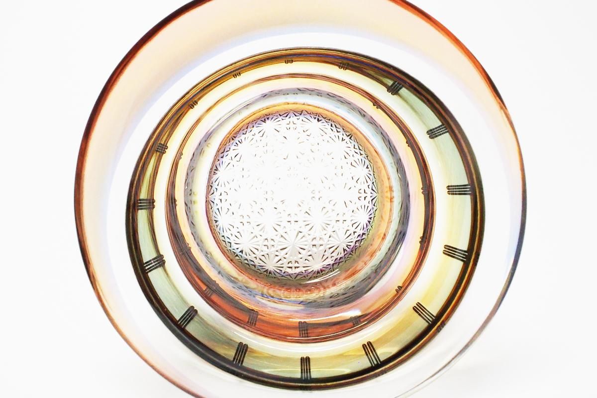 「サギング」は電気炉を使用したガラス工芸技法のひとつで、丸い穴の開いた板状の型の上に板ガラスを置いて熱することで、穴からガラスを落として器をつくる技法です。そのサギングと切子を組み合わせたオリジナル技法が「サギング切子」です。
