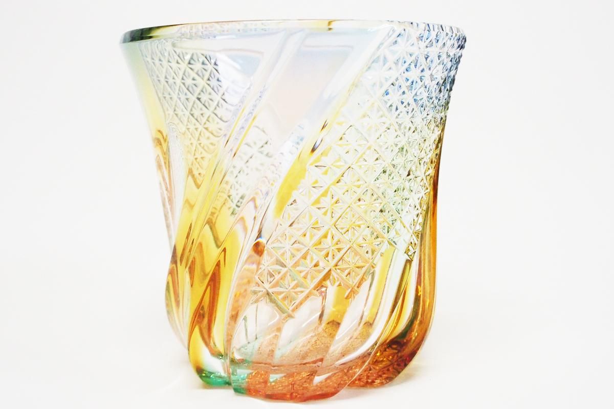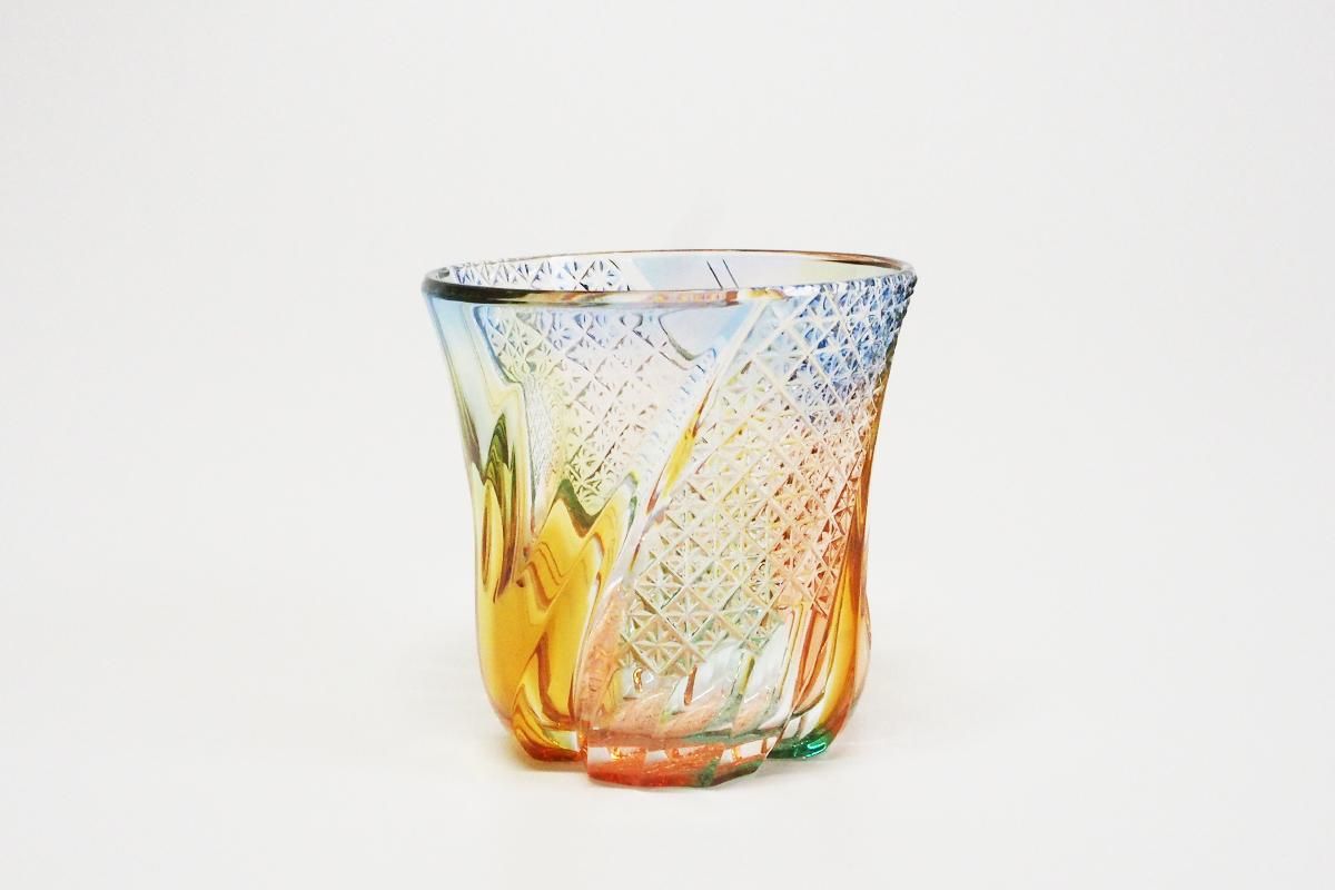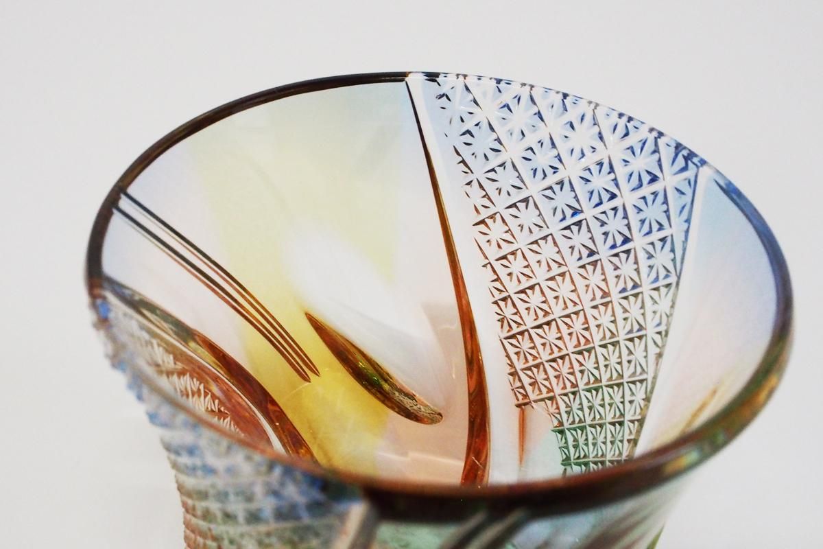 All Uno glass pieces are one-of-a-kind, created by Kouhei Kobayashi using his original "Sagging faceting(kiriko)" technique. First, the vessels are made in an electric furnace using the sagging technique, which utilizes heat and gravity, and then kiriko is applied to the shaped vessels to complete the process. The name "Uno glass" has two meanings. One is that he creates each piece by himself, from the production of the glass material to the final product, The other is that when sagging, the glass melts and falls through the hole, which looks like the letter U.