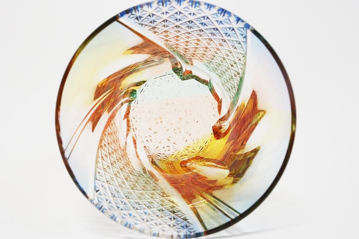 「サギング」は電気炉を使用したガラス工芸技法のひとつで、丸い穴の開いた板状の型の上に板ガラスを置いて熱することで、穴からガラスを落として器をつくる技法です。そのサギングと切子を組み合わせたオリジナル技法が「サギング切子」です。